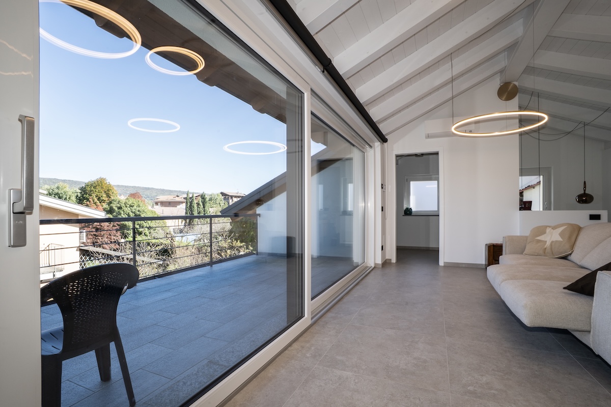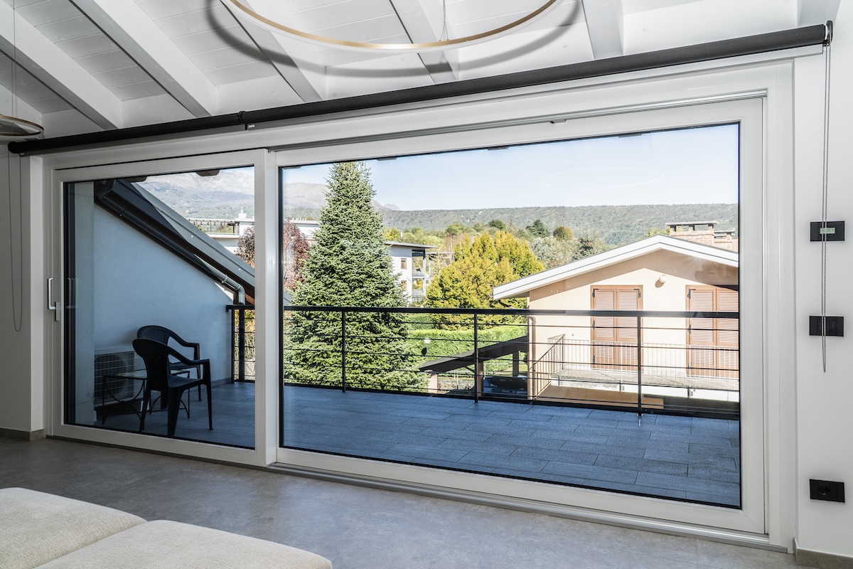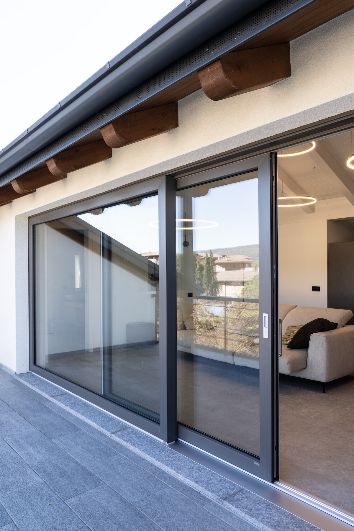 Elemento centrale del progetto è la portafinestra scorrevole nel sottotetto, larga oltre 5 metri, realizzata con estrema precisione per assicurare funzionalità, stabilità e un forte impatto estetico. L’ampia vetrata crea una continuità naturale tra interno ed esterno, rendendo gli spazi più aperti e vivibili.