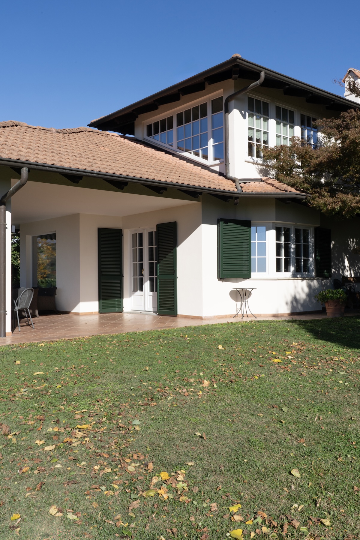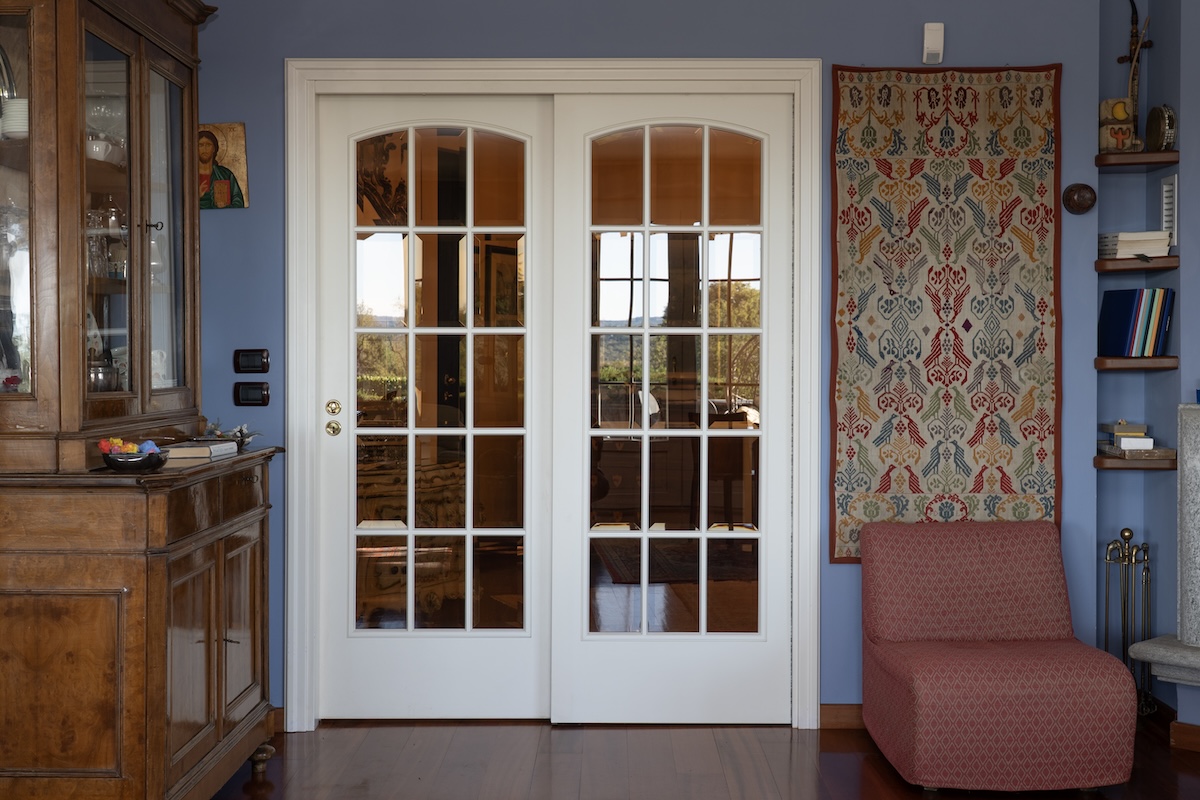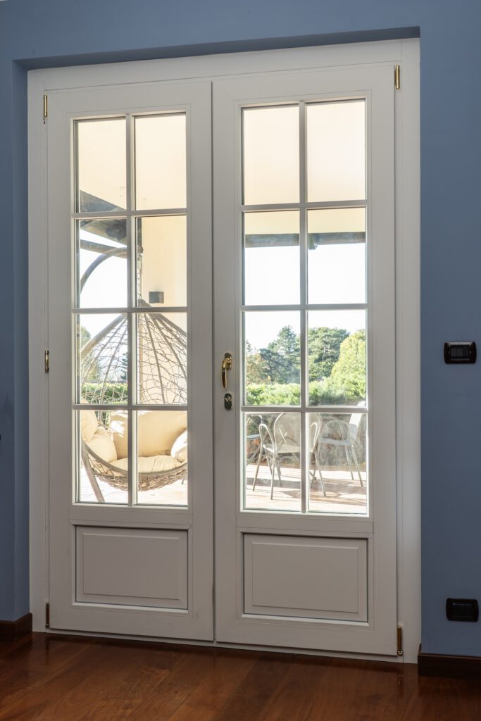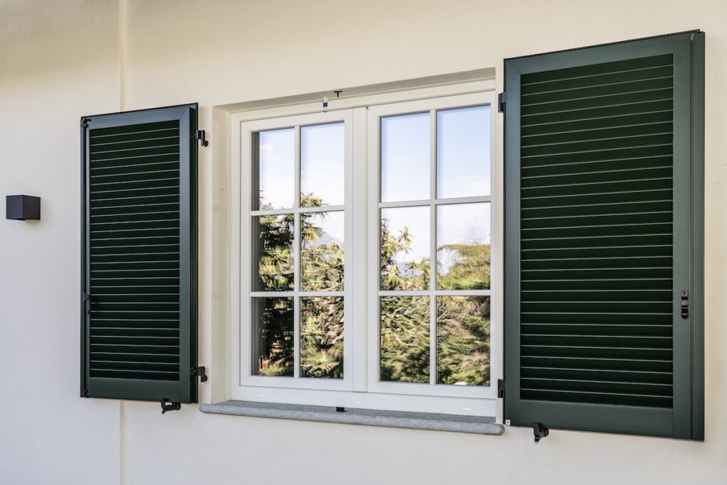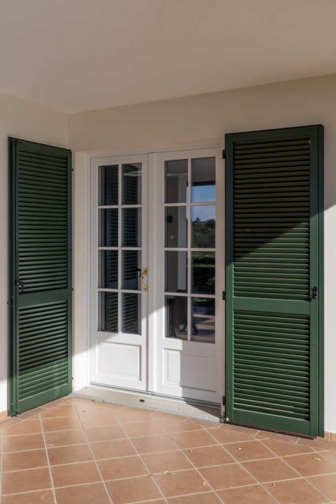 A completamento dell’esterno, sono state installate persiane in alluminio con cardini murati, soluzione che unisce durata nel tempo e rispetto della tradizione. Il portoncino, realizzato nello stesso colore delle persiane, garantisce continuità estetica e coerenza dell’insieme.